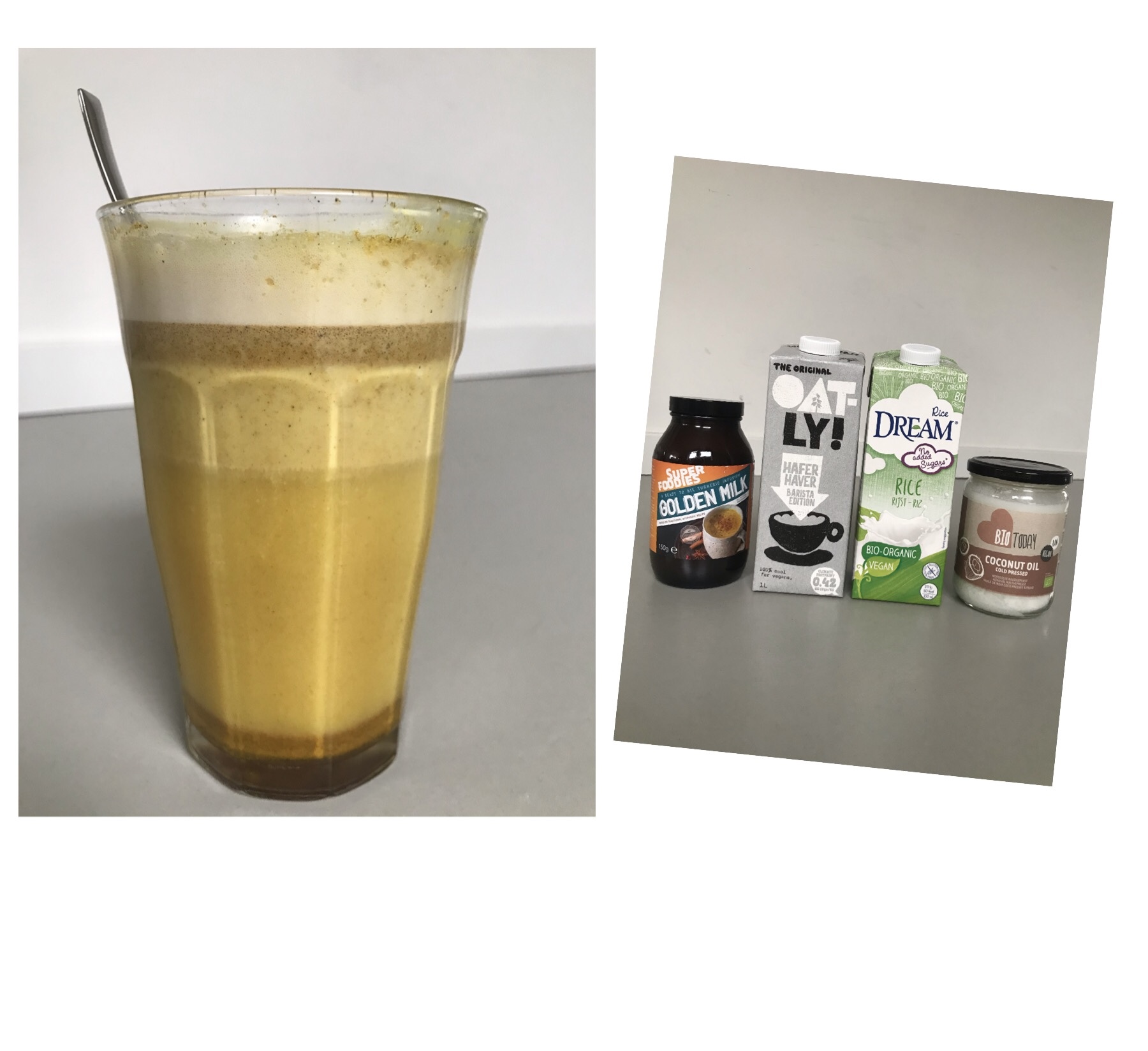 De rijstmelk heb ik warm gemaakt in een pannetje en daarbij heb ik een beetje kokosolie toegevoegd. Door de olie kan de kurkurma beter in je lichaam opgenomen worden. 1 eetlepel Golden Milk poeder toegevoegd en daarna heb ik nog opgeklopte Barista havermelk van Oatly toegevoegd.